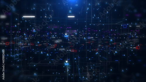Digital technology big data connection fly through loop. Abstract simple geometric shape with binary number code illustration background.