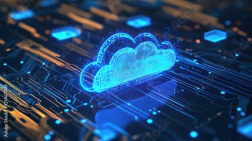 Digital technology cloud concept with glowing light particles and blue sky background