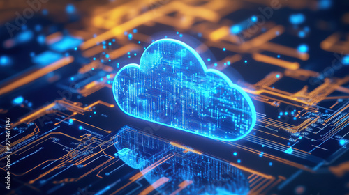 Digital technology cloud concept with glowing light particles and blue sky background