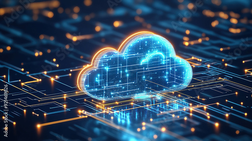 Digital technology cloud concept with glowing light particles and blue sky background