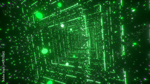 Digital technology tunnel. 3D illustration Big Data Digital square corridor with futuristic matrix. Binary code particle network. Motion and communication technology background. Flashing particles.