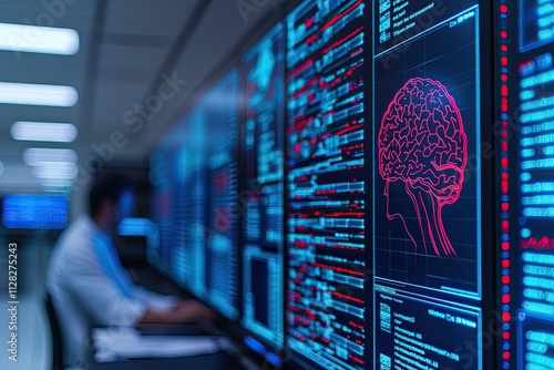 digital transformation business modernization High-tech workspace featuring brain graphics and data on multiple screens.