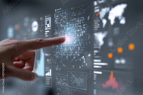 Digital transformation concept illustrates system engineering with data visualization and user interaction on a touchscreen device displaying computer analytics