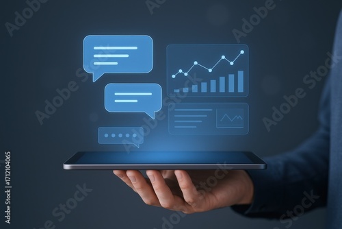 Digital Transformation: Hand Holding Tablet with Data Visualization, Chat Icons, and Business Analytics for Modern Communication
