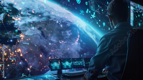 Digital transformation internet network technology big data futuristic technology background man using computer with global network connection data link and exchange on virtual screen : Generative AI