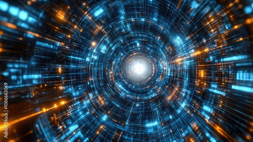 Digital tunnel with vibrant blue and orange lights spiraling towards a bright central white light, creating a futuristic and dynamic atmosphere.