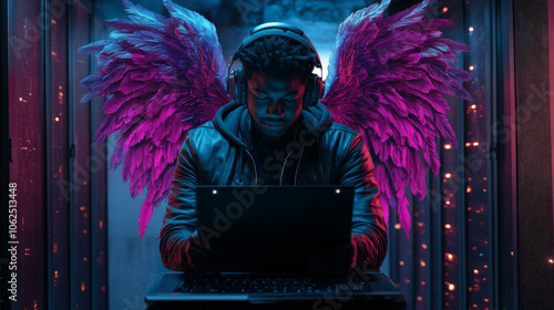 digital warrior with vibrant wings, focused on battling malware in tech environment. scene is illuminated with neon colors, creating dynamic atmosphere