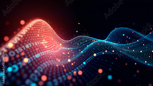 Digital wave pattern with binary code and glowing particles in a futuristic design