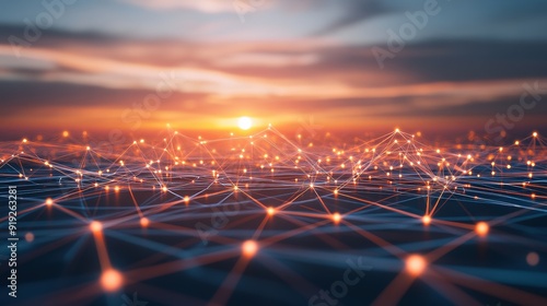 Digital web of interconnected lines and nodes representing a network at sunset