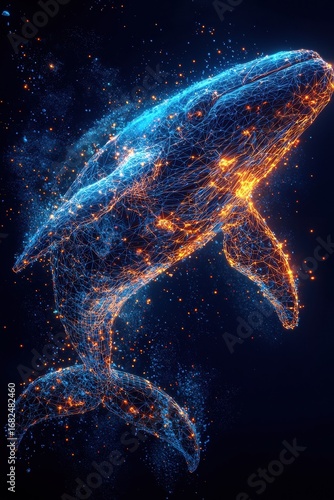 Digital whale in glowing wireframe art with data-inspired visual effects