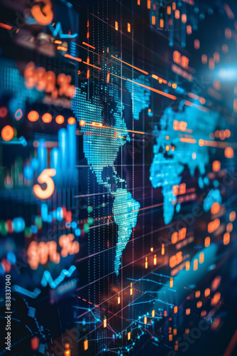 Digital World Map with Data Visualization, Global Network Connections, and Financial Analytics