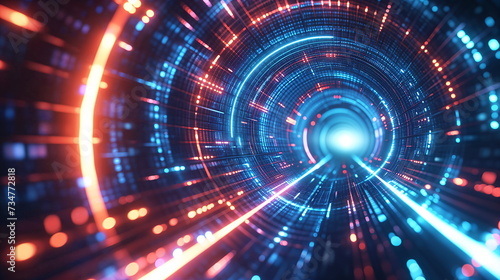 Digitally generated image of an abstract circular data tunnel visualizing speed and technology. Data cyberspace with swirling binary code and light. Generative AI