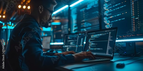 Diligent Programmer Typing Code on Laptop in Modern Tech Office. Concept Programmer Lifestyle, Coding in Office, Tech Workspace, Modern Work Environment, Diligent Programmer
