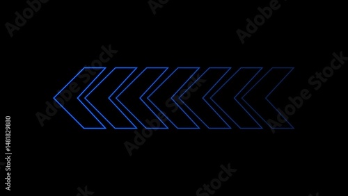 Directional arrow design in blue neon effect arranged in a repeating pattern on a black backdrop suitable for navigation technology and digital interface designs