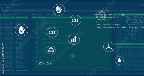 Displaying dashboard with code panels, encryption logs and environmental icons on teal screen