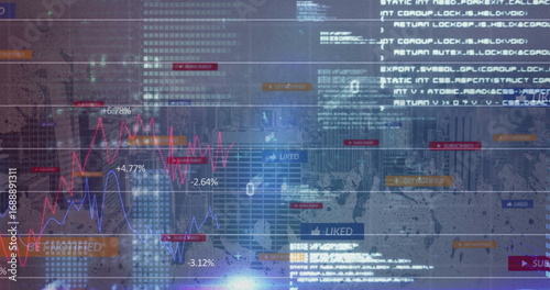 Displaying financial overlay merging code snippets and stock charts in city skyline, with UI badges