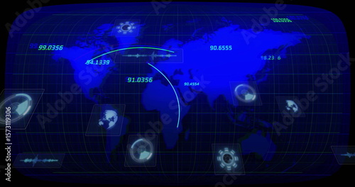 Displaying graphical interface with world map, numeric labels on grid and curved arcs on dashboard