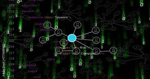 Displaying highlighted central avatar node linking avatars in cyber network, with binary digits