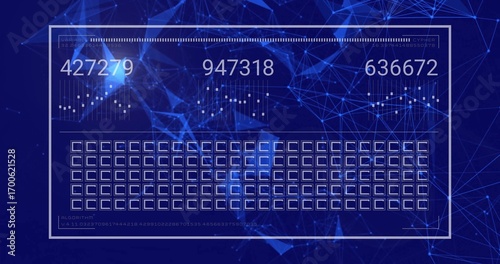 Displaying white overlay rendering numeric codes with bar graphs and grid in blue network backdrop