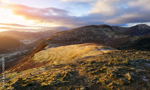 Distant hikers on a bright orange sunny winters morning sunrise over Borrowdale from Cat Bells with the summits of Maiden Moor, High Spy & Dale Head in the distance. Lake District, UK.