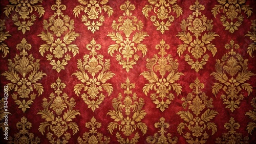 Distressed red velvet wallpaper with intricate floral patterns and gold accents, flowers, distressed, flowers
