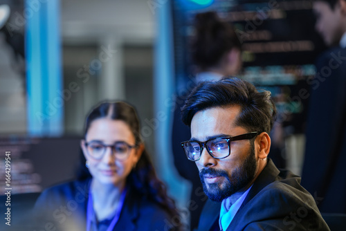 diverse AI developers collaborate in a late-night coding session. A senior engineer mentors his colleague as they program a complex machine learning algorithm together.