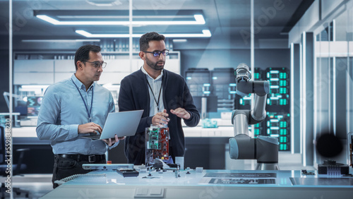 Diverse Colleagues of Industrial Robotics Engineers Experimenting With Robotic Arm. Scientists Use Laptop Computer to Manipulate and Program the Robot to Move and Put Down a Powerful Microchip.
