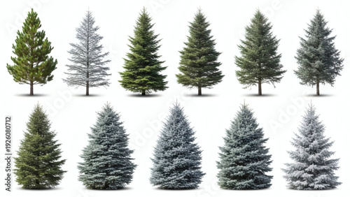 Diverse Collection of Evergreen Conifer Trees, Including Spruce and Fir, in Various Green Hues and Winter Frost, Ideal for Seasonal and Nature-Themed Design Projects
