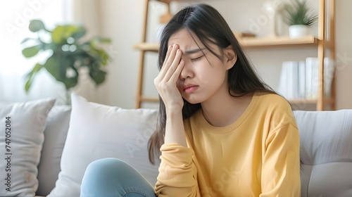 Dizzy asian young womann girl headache or migraine pain suffering from vertigo while sitting on couch in living room at home holding nose with hand,health problem of brain or inner ear not balancee