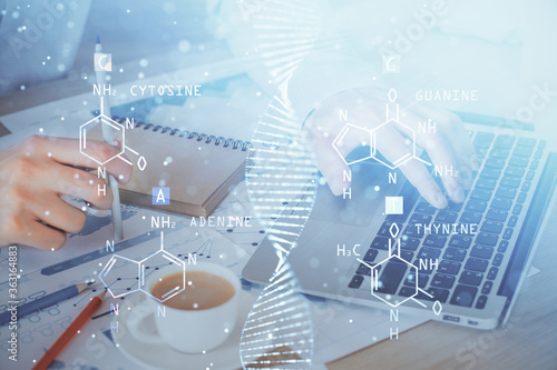 DNA hologram with businessman working on computer on background. Concept of bioengineering. Double exposure.