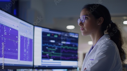 Doctor Analyzing Patient Data on Dual Computer Screens in Lab