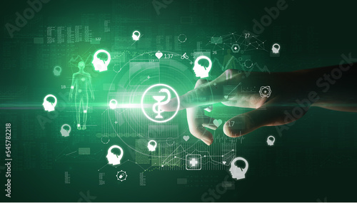 Doctor hand pressing futuristic health device with medical symbol on screen