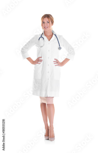 Doctor with stethoscope on white background