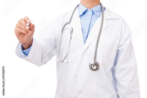 Doctor writing with pen at copyspace on white background