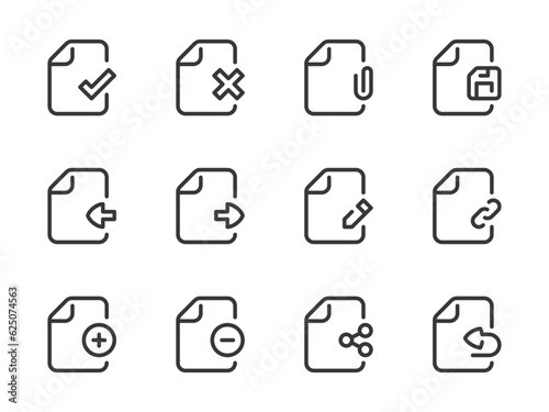 Document and File Management vector line icons. Data settings and File Configurations outline icon set. Approve, Reject, Send, Receive, Edit, Attach, Save, Share and more.