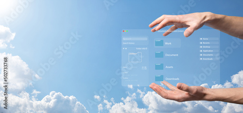Document management concept. Virtual screen icons Document Management System DMS Online document database, software for efficient archiving, searching and management of company files and data.