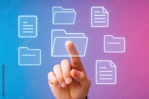 Document Management System Concept: Hand Interacting with Digital Folders and File Icons on Gradient Background