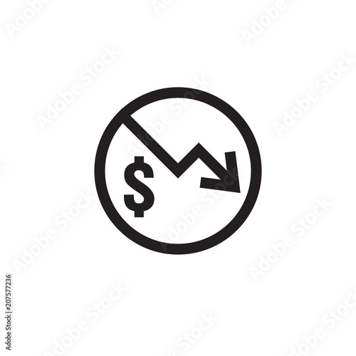 dollar decrease icon. Money symbol with arrow stretching rising drop fall down. Business cost reduction icon in white background. vector illustration.