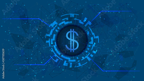 Dollar USD coin symbol in circle with digital theme on blue background. American currency icon for website or banner. Copy space. Vector EPS10.