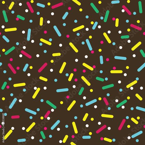 Donut glaze seamless pattern. Cream texture with topping of colorful sprinkles and beads on chocolate background. Food bakery decoration. Vector eps8 illustration.