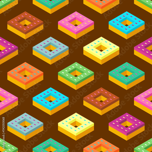 Donut isometric pattern seamless. Sweetness Fast food background