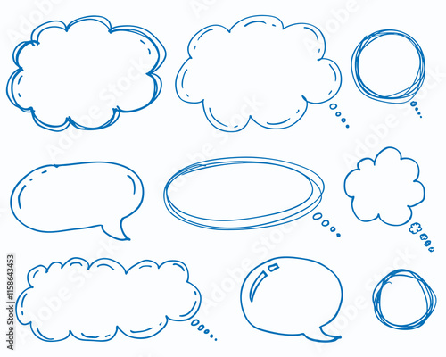 Doodle thinking clouds, chat cartoon bubbles. Hand drawn set, vector, isolated.