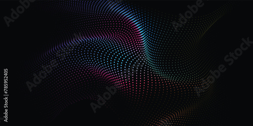 Dot particles flowing waves 3D curve pattern blue and green gradient light isolated on black background. Vector in AI technology