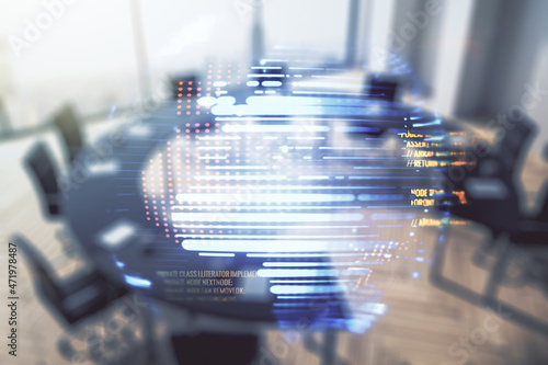 Double exposure of abstract creative programming illustration and world map on a modern boardroom background, big data and blockchain concept
