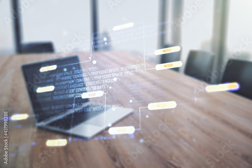 Double exposure of abstract creative programming illustration on computer background, big data and blockchain concept