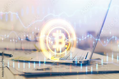 Double exposure of blockchain theme hologram and table with computer background. Concept of bitcoin crypto currency.