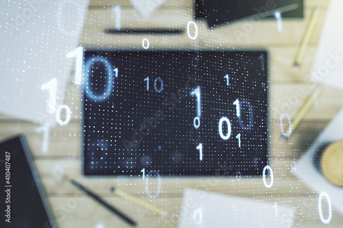 Double exposure of creative abstract binary code hologram and digital tablet on background, top view. Database and programming concept