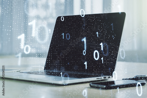Double exposure of creative abstract binary code hologram on laptop background. Database and programming concept