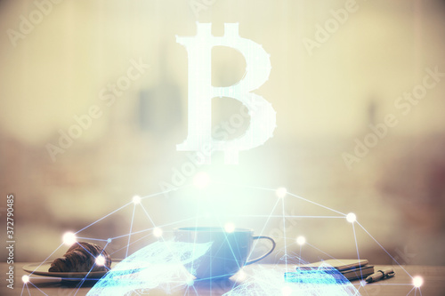 Double exposure of crypto currency theme drawing hologram over coffee cup background in office. Concept of international blockchain.
