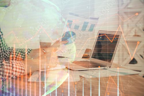 Double exposure of financial graph with man works in office on background. Concept of analysis.